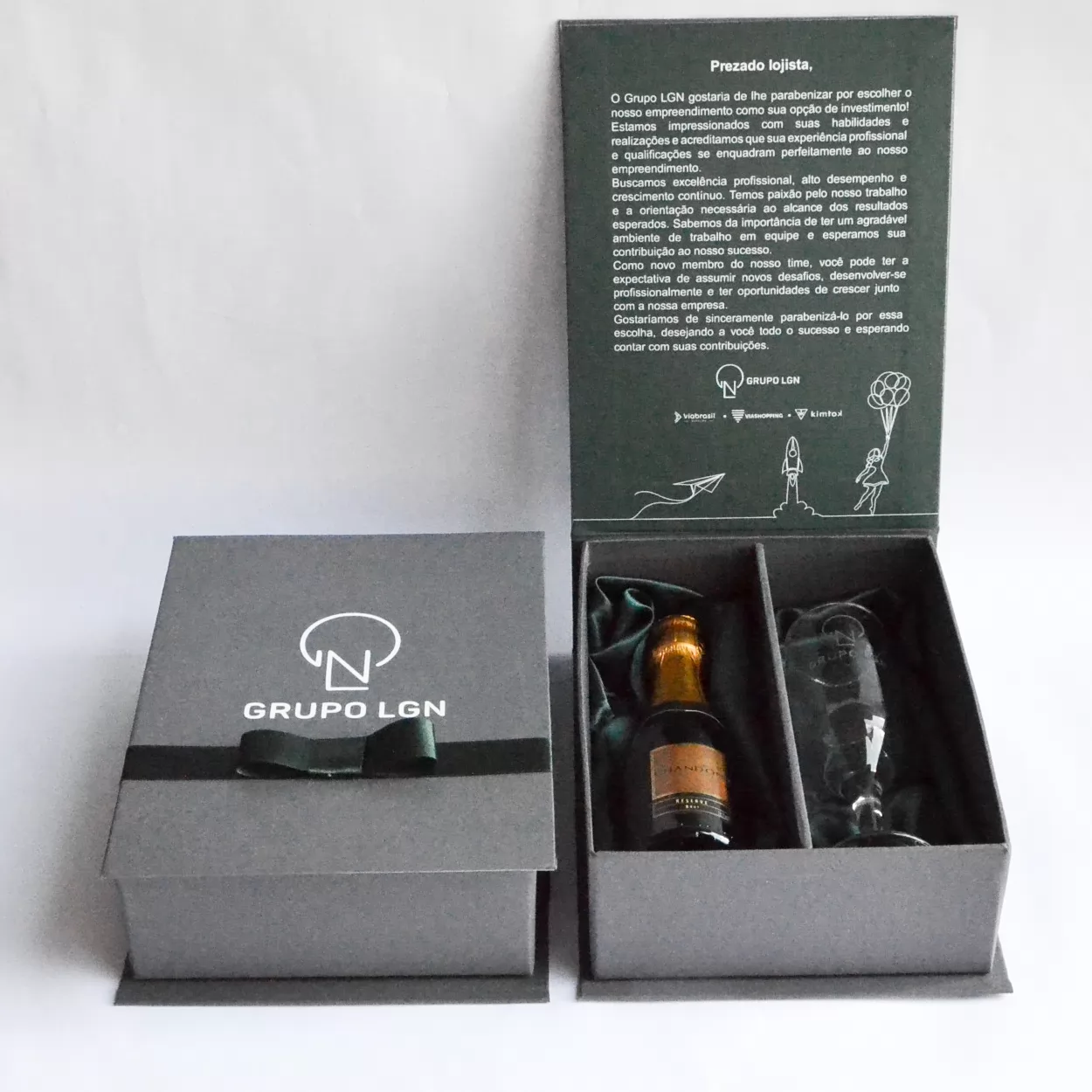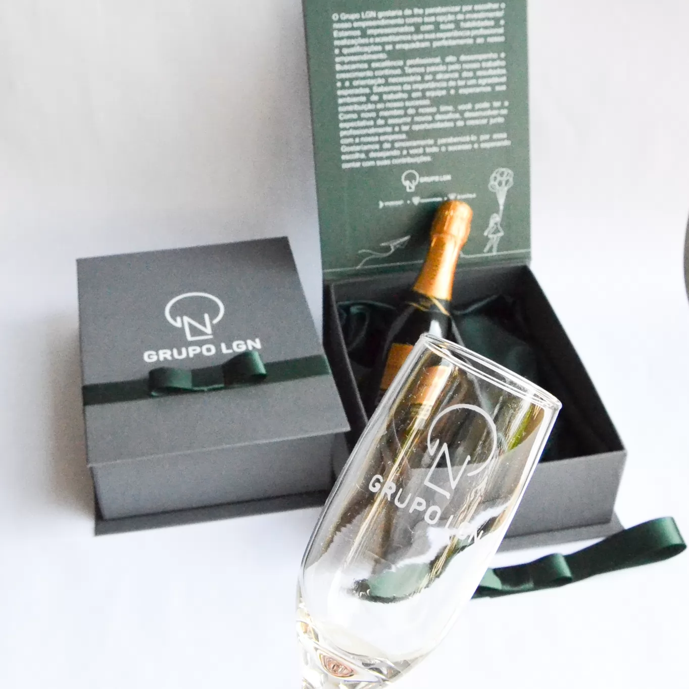 Especificações: Caixa Rigida (Diversas opções de cores) Mensagem Personalizada na Tampa 1 Taça Nadir 180ml, Lisa ou Personalizada (Gravação a Laser 1 Chandon Baby